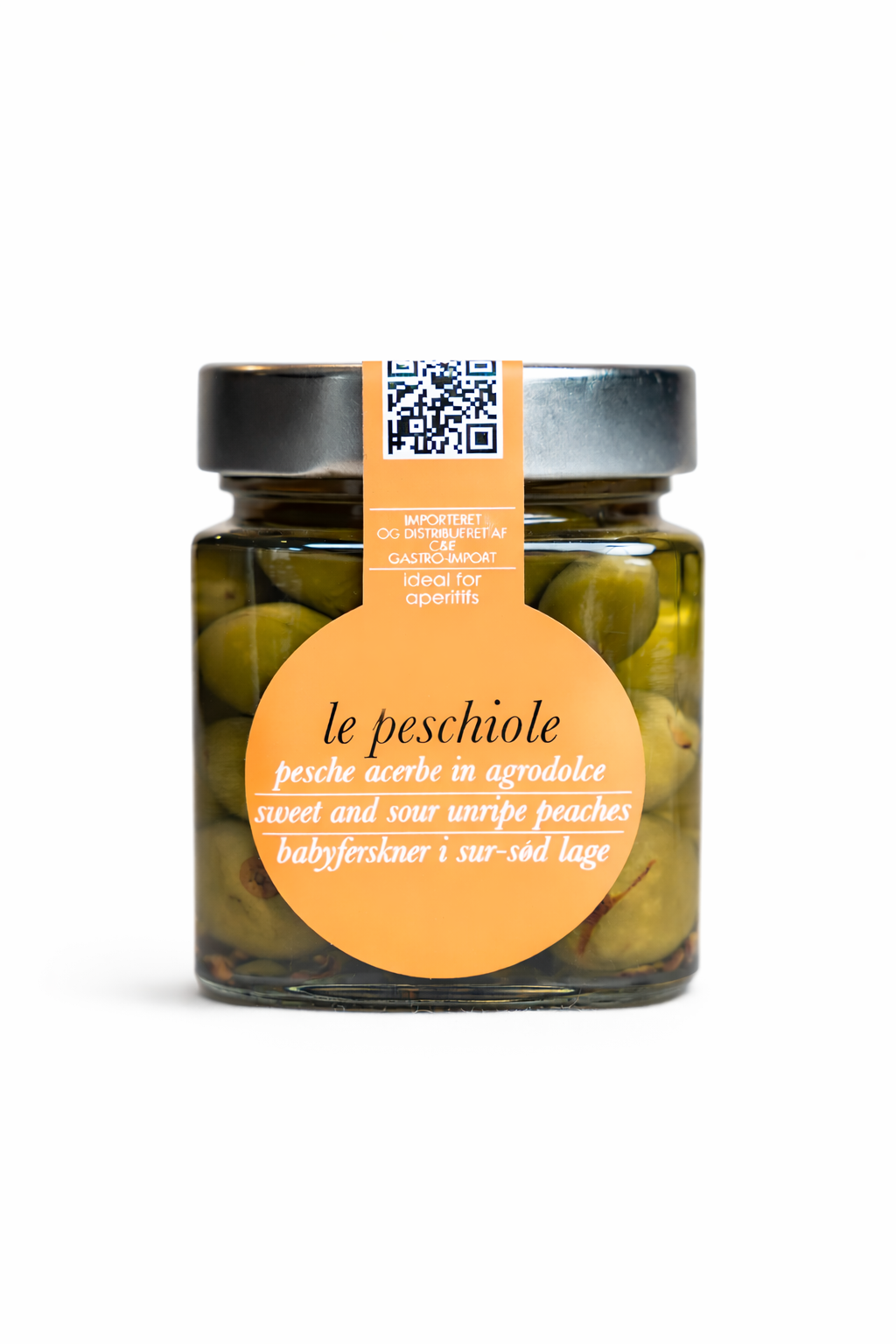 Le Peschiole – Babyferskner i sursøt lake er en sjelden italiensk delikatesse laget av små, faste unge ferskner konservert i en elegant balanse av sødme og syrlighet. Disse små fruktperlene er sprø, aromatiske og helt unike i tekstur – en ekte gourmetopplevelse.