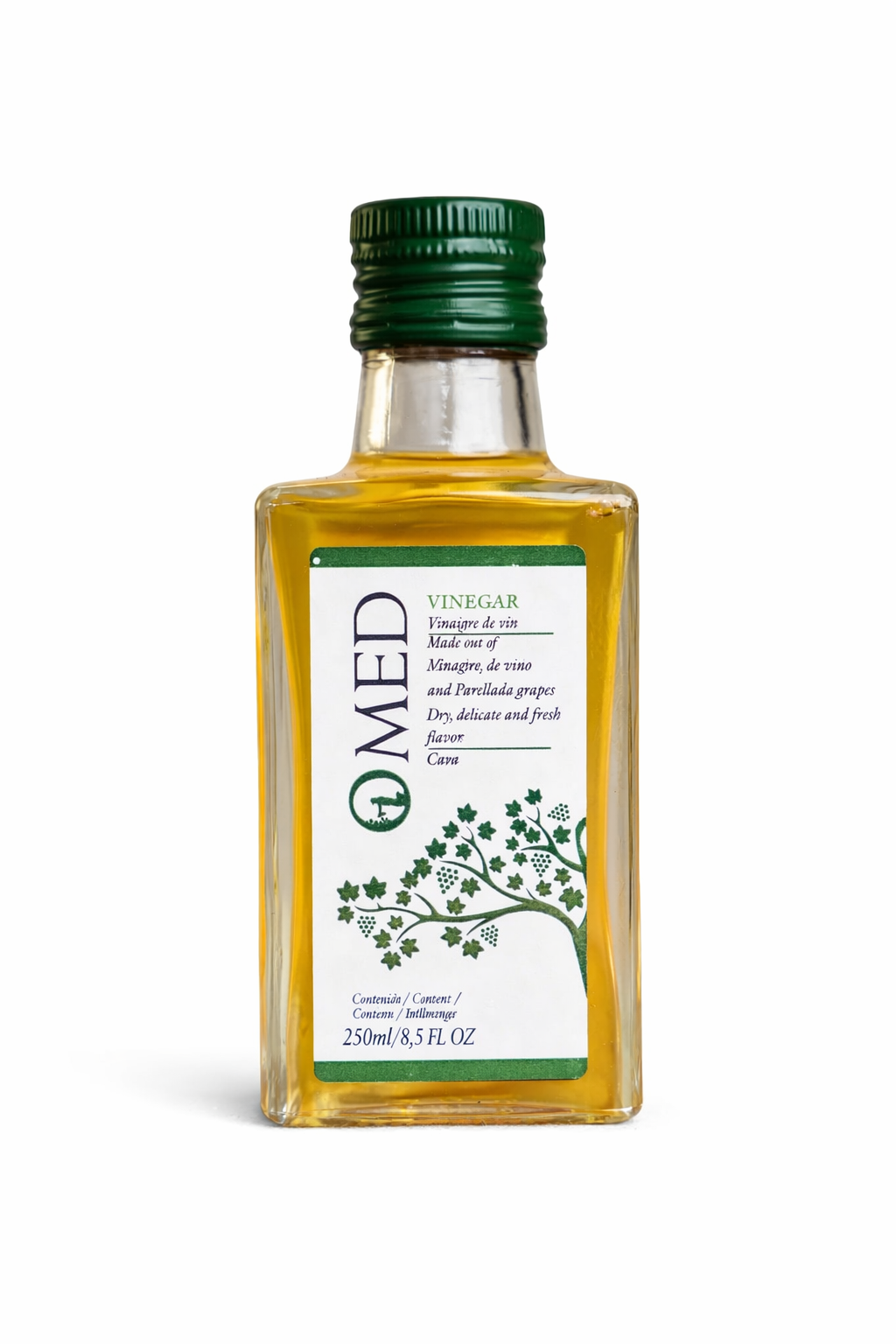 O-Med Cava eddik er en lys og elegant vinegar laget på klassiske cava-druer som Macabeo, Xarel·lo og Parellada. Resultatet er en frisk, delikat syrlighet med florale og fruktige toner – perfekt når du vil løfte salater, sjømat og grønnsaker uten at smaken blir dominerende.