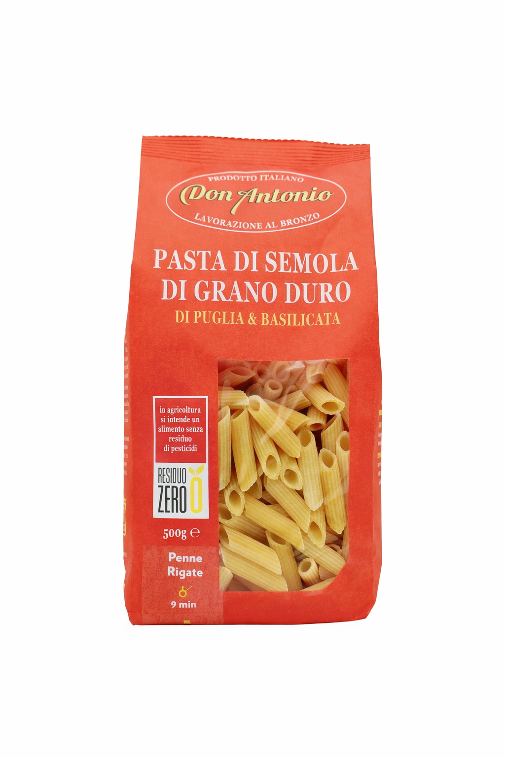Penne Rigate 500 g – Don Antonio er bronzepresset kvalitetsÂpasta laget av 100 % durumhvete semolina og fjellvann fra Abruzzo. De rillede rørene har en ru overflate som gjør at sausen fester seg optimalt – og gir en rikere, mer autentisk pastasmak.